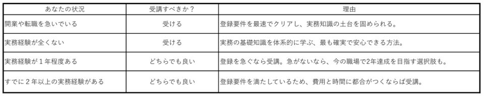 - ❌ 不要な人: 実務経験がすでに2年以上ある方、または現時点で登録予定がない方。